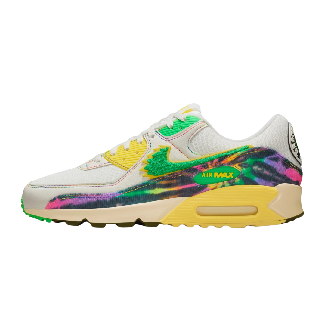 De Nike Air Max 90 Grateful Dead University of Oregon “Grateful Ducks” is een opvallende drievoudige samenwerking die sport, muziek en cultuur samenbrengt. Nike eert met dit model zowel de University of Oregon Ducks – de universiteit waar het merk zelf is ontstaan – als de iconische rockband Grateful Dead, bekend om hun kleurrijke, vrije stijl en legendarische concerten in het stadion van Oregon.