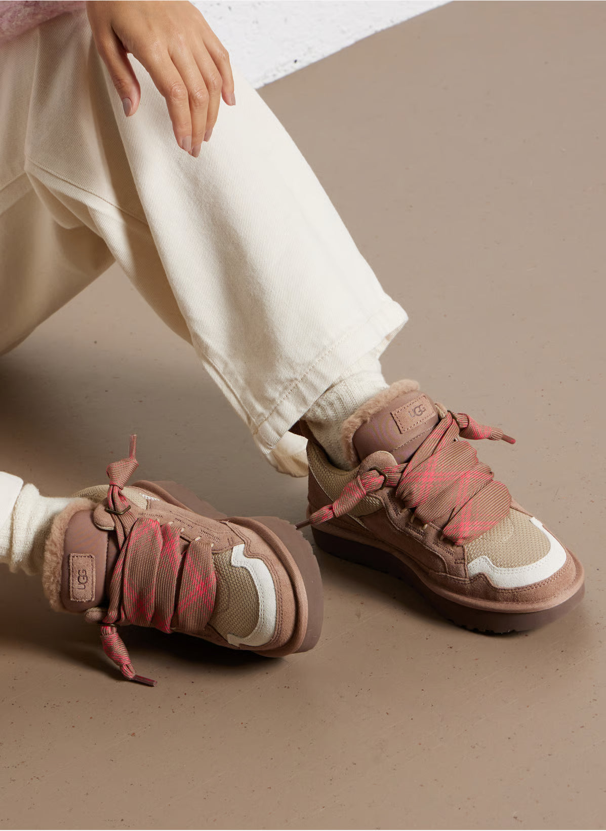 Het bovenwerk is uitgevoerd in waterafstotend suède en textiel in de warme tint Rocky Oak, een aardse kleur die balans biedt tussen casual en premium. De ton-sur-ton details en subtiele stiksels benadrukken de verfijnde afwerking. Binnenin zorgt de UGGplush™-voering (gerecyclede wol en lyocell) voor zacht comfort en natuurlijke warmte, terwijl de ademende mesh-panelen bijdragen aan ventilatie.