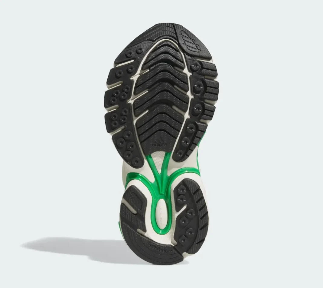 Het bovenwerk is opgebouwd uit gerecycled mesh en synthetische overlays, uitgevoerd in de levendige tint Real Green. De frisse groene kleur verwijst naar natuurlijke energie en beweging, versterkt door organisch gevormde panelen die de schoen een bijna vloeibare dynamiek geven. De transparante details en het sculpturale lijnenspel herinneren aan de golvende vormen van een kwallenlichaam de inspiratie achter de naam Jellyfish.